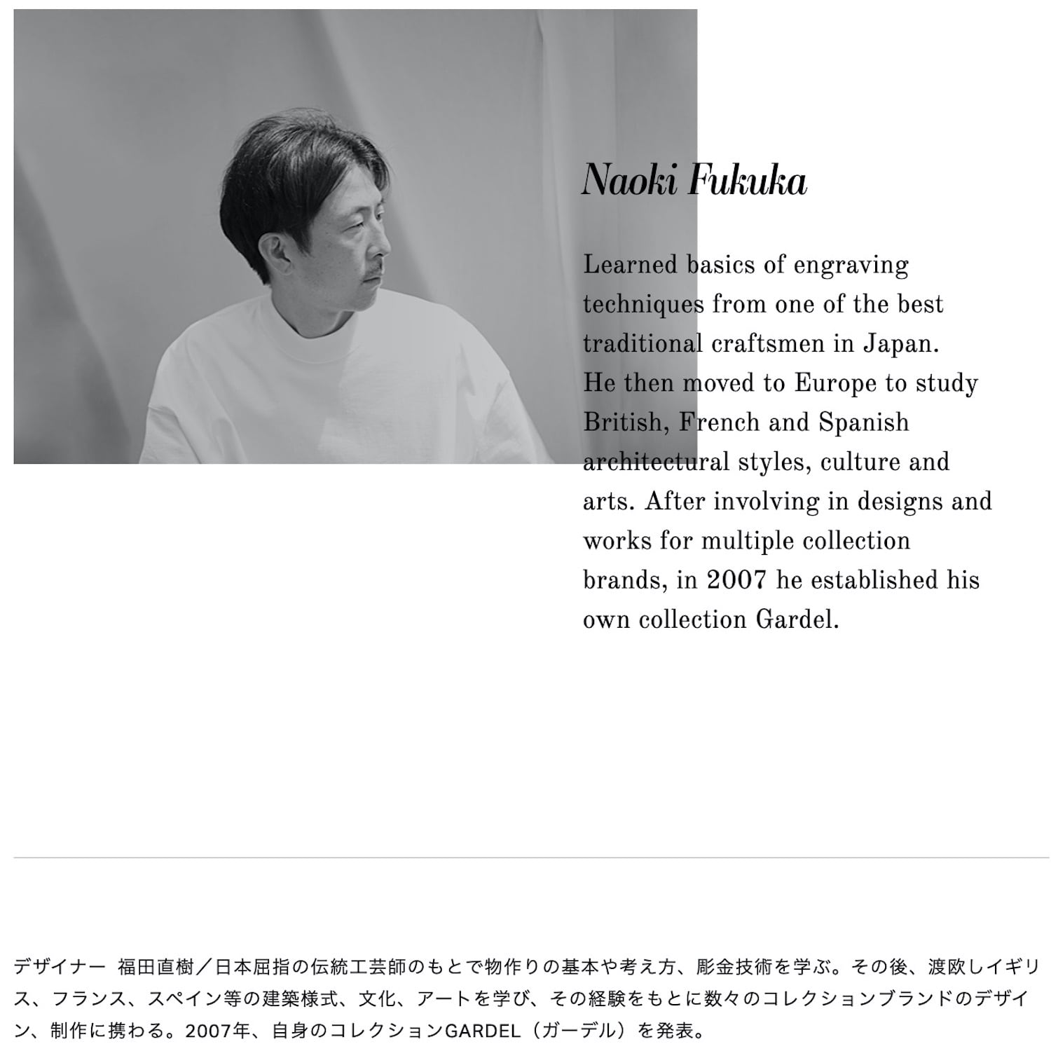 【GARDEL】天皇陛下等の置物やオブジェ製作を行っている、日本屈指の伝統工芸師のもとで技術を習得。 某有名ジュエリーブランドでのクリエーション経験を経て、2007年に自身のコレクションを発表。 「0.1ミリ以下の単位で、完璧なバランスや美しいラインを生み出していく」と語る、デザイナーの福田直樹氏。 その言葉通り、しなやかな曲線や仕上げの美しさ、繊細な石使いから生まれるジュエリーは、「気品」や「色気」を感じさせる。 これからもよりモードに進化し続けるガーデルから目が離せない。