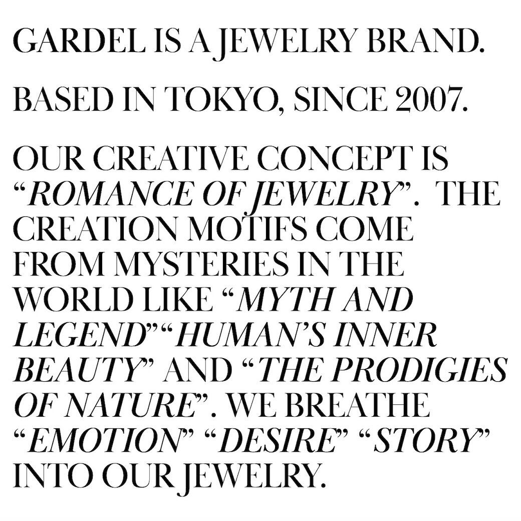 【GARDEL】天皇陛下等の置物やオブジェ製作を行っている、日本屈指の伝統工芸師のもとで技術を習得。 某有名ジュエリーブランドでのクリエーション経験を経て、2007年に自身のコレクションを発表。 「0.1ミリ以下の単位で、完璧なバランスや美しいラインを生み出していく」と語る、デザイナーの福田直樹氏。 その言葉通り、しなやかな曲線や仕上げの美しさ、繊細な石使いから生まれるジュエリーは、「気品」や「色気」を感じさせる。 これからもよりモードに進化し続けるガーデルから目が離せない。